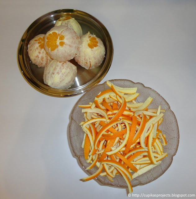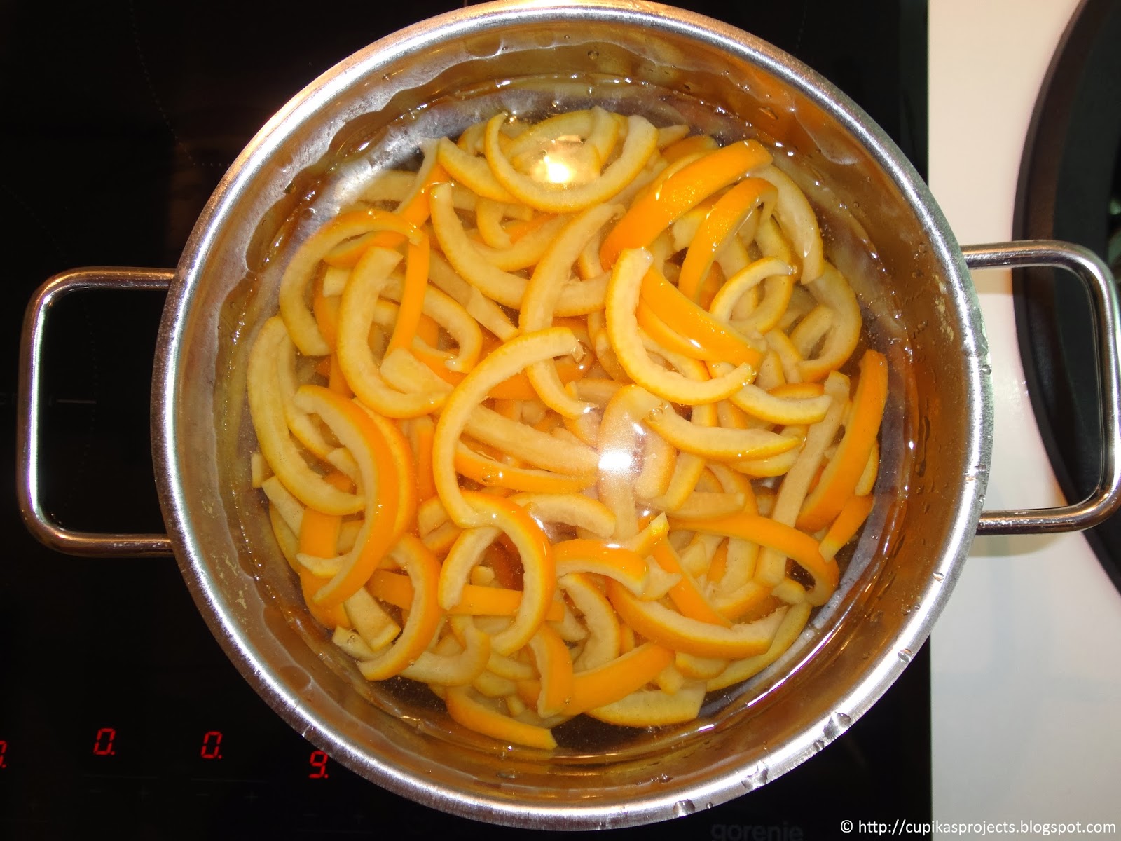 Pomaranče sem dobro oprala in osušila. Odrezala sem vrh in dno pomaranče, nato pa olupek zarezala na četrtine. Pri tem sem pazila, da sem zarezala le v olupek in ne v meso pomaranč. Pomaranče sem olupila in narezala na trakove, široke približno 1/2 cm. Narezane trakove sem stresla v večji lonec, ter dolila toliko vode, da so bili trakovi pokriti. Vodo sem zavrela, nato pa jo odlila in postopek ponovila trikrat. S tem sem dosegla, da so olupki izgubili grenkobo, ter pridobila primerno mehkobo olupkov.